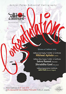 This workshop (elective) started with learning basic hands – traditional roman italic and devanagri scripts, then moving to bit free brush letterings, then total experimental and conventional ruling pen, cola pen with mark making. In between they were inspired with videos, presentations of the works of national & international calligraphers around the world.